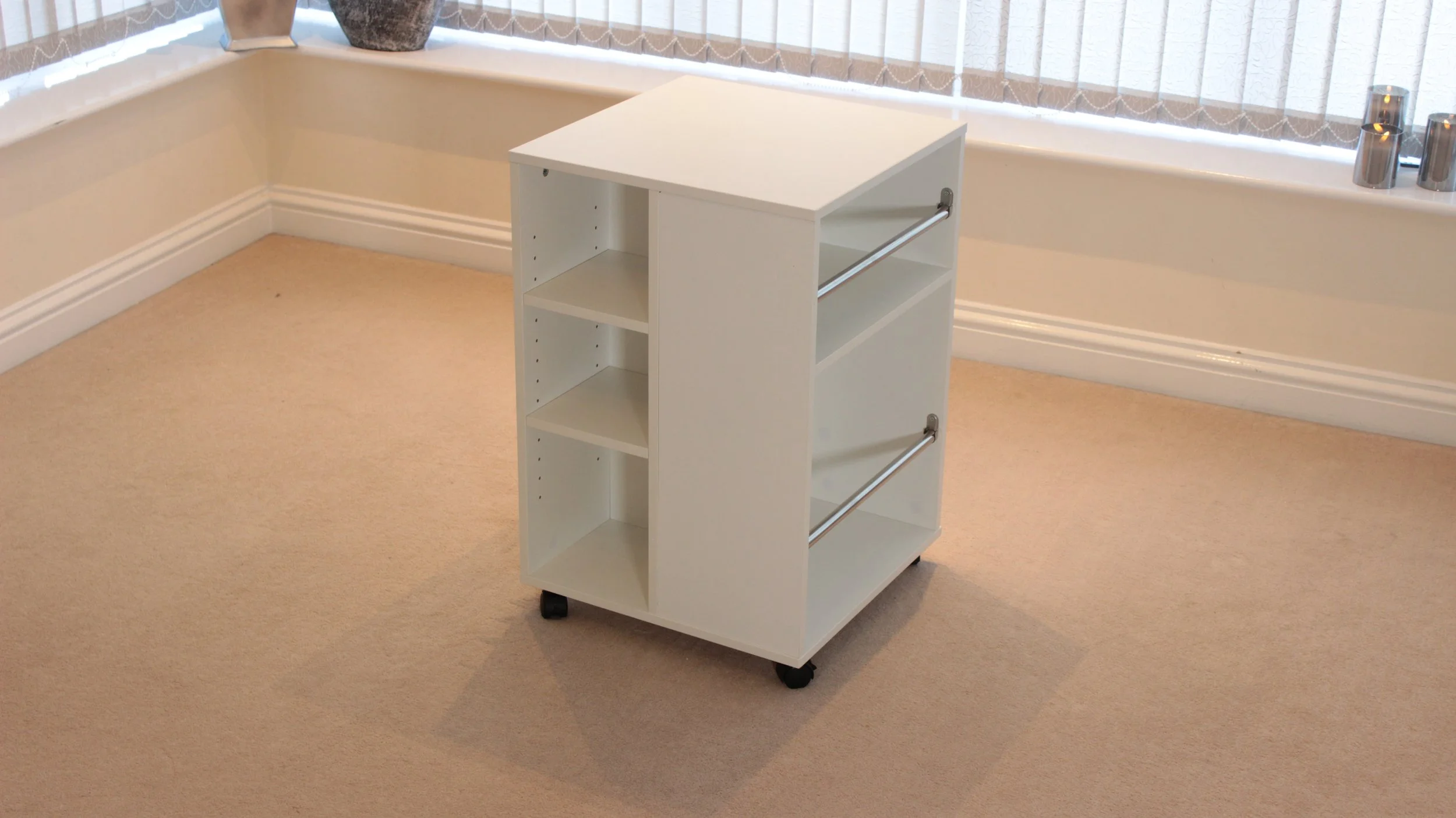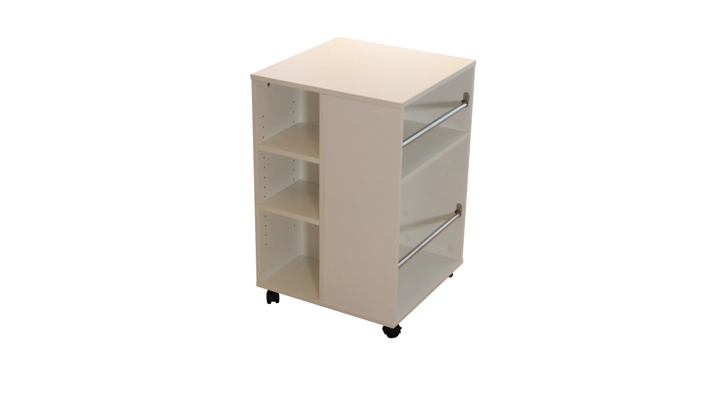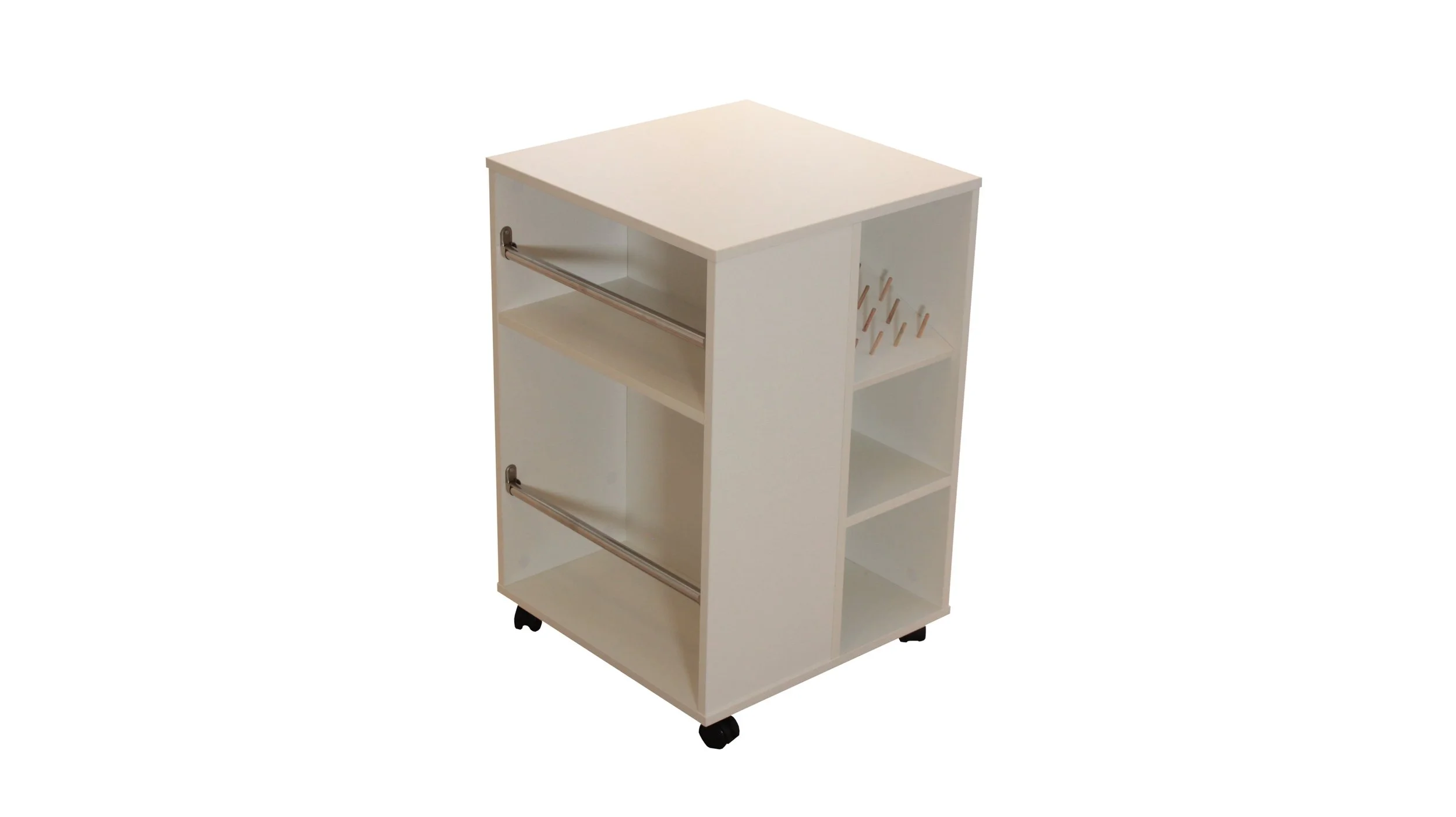 White rolling storage cart with open shelves, two metal rods on the front, and smaller compartments on the side.