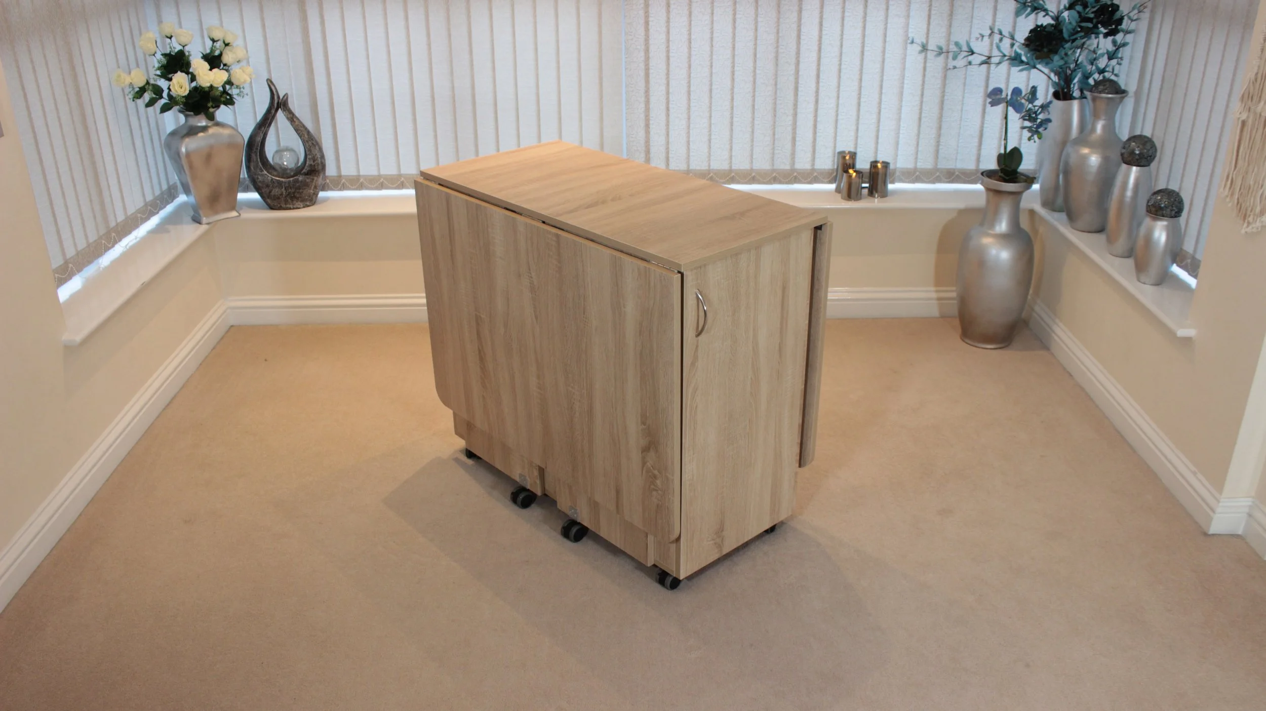 When it's time to tidy up simply fold down the side leaves for neat and easy storage. With cupboards on each side, stash your machines on one end and accessories in the four roomy transparent trays on the other. It's a crafter's dream!