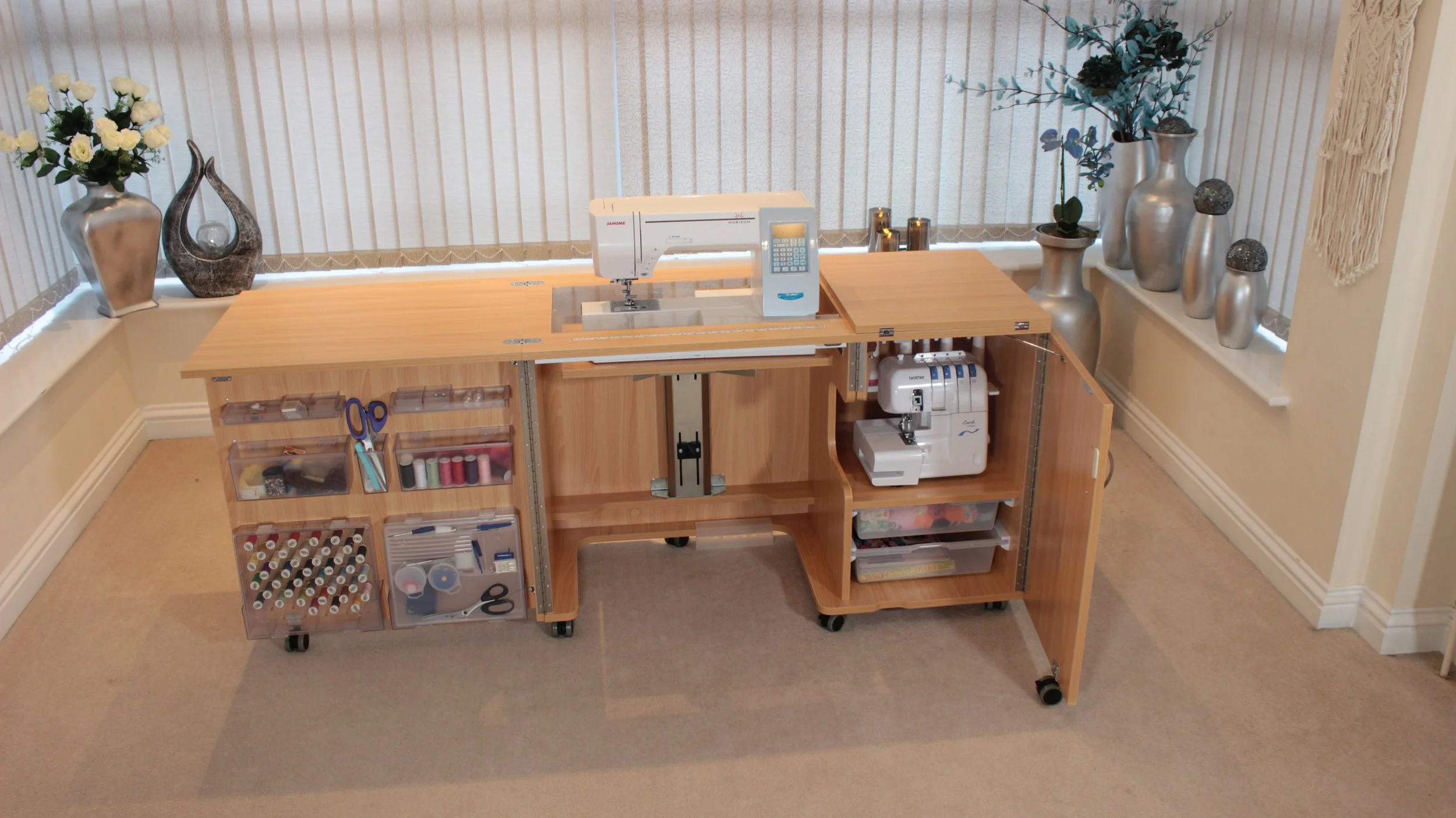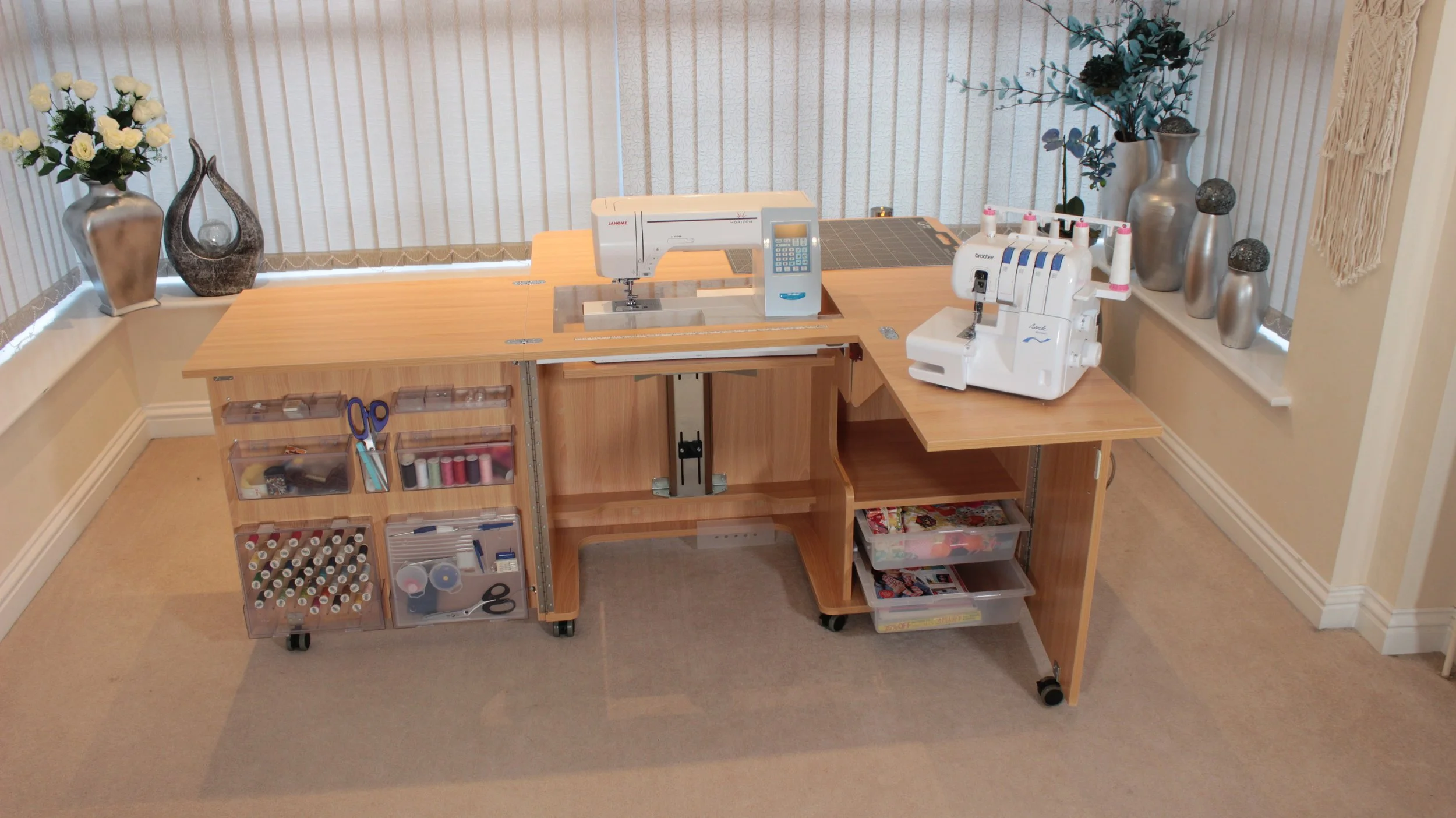 Stores both a sewing machine and an overlocker, or maybe a second smaller portable machine if you prefer.