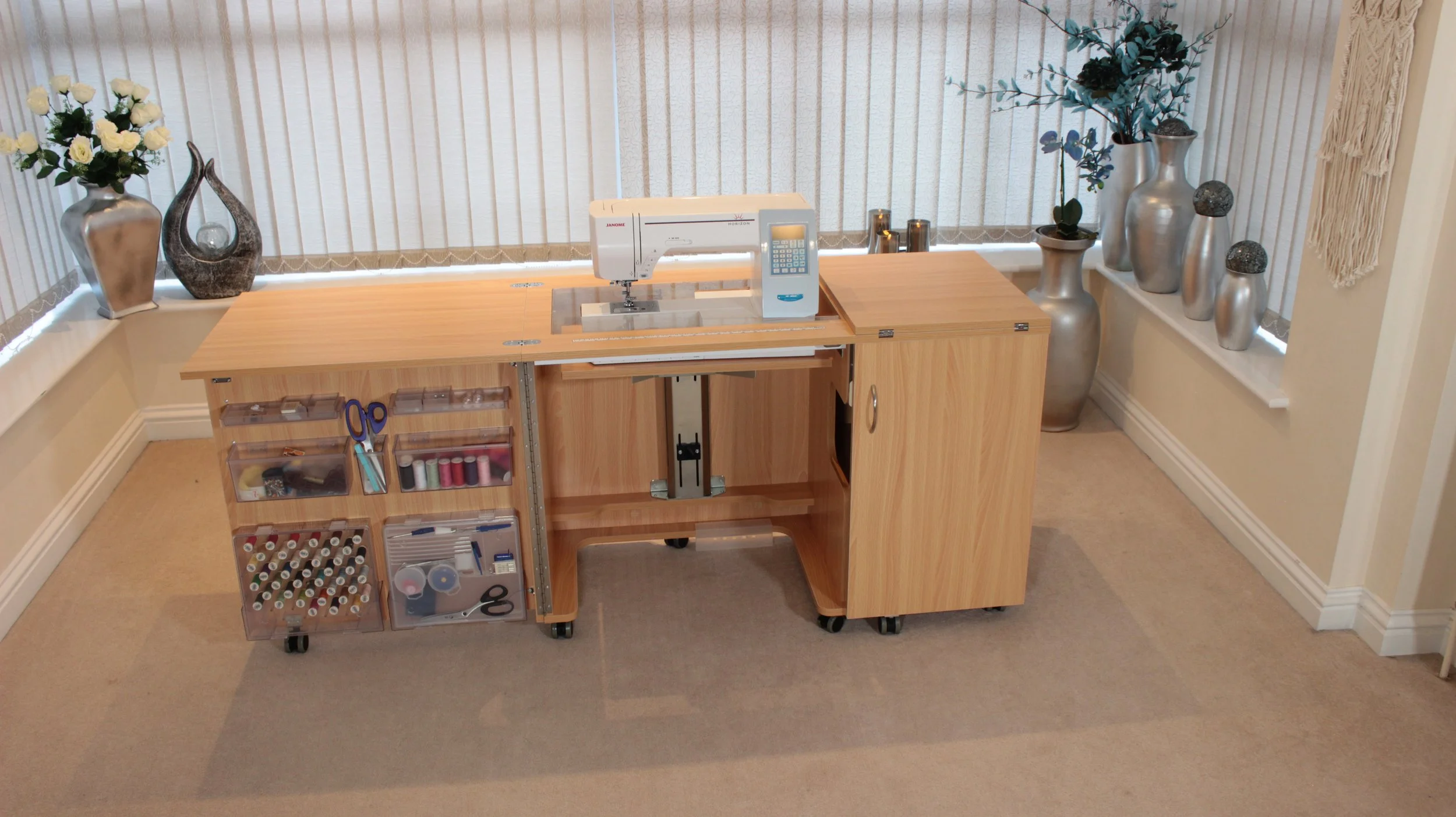 This model arrives fitted with our 3-step push down release air-lift mechanism which means a quick push down moves your machine from storage to flatbed to free-arm positions.