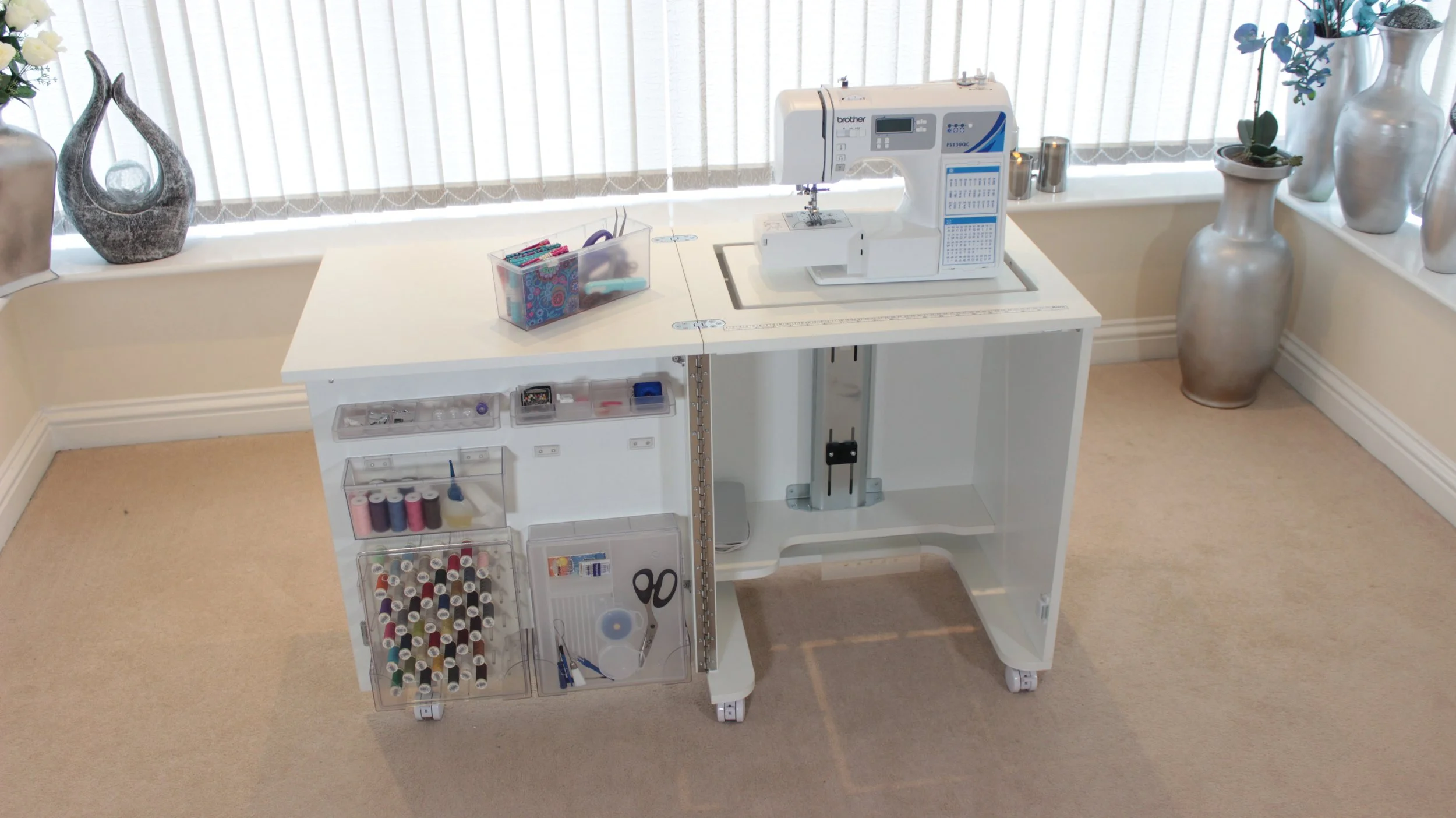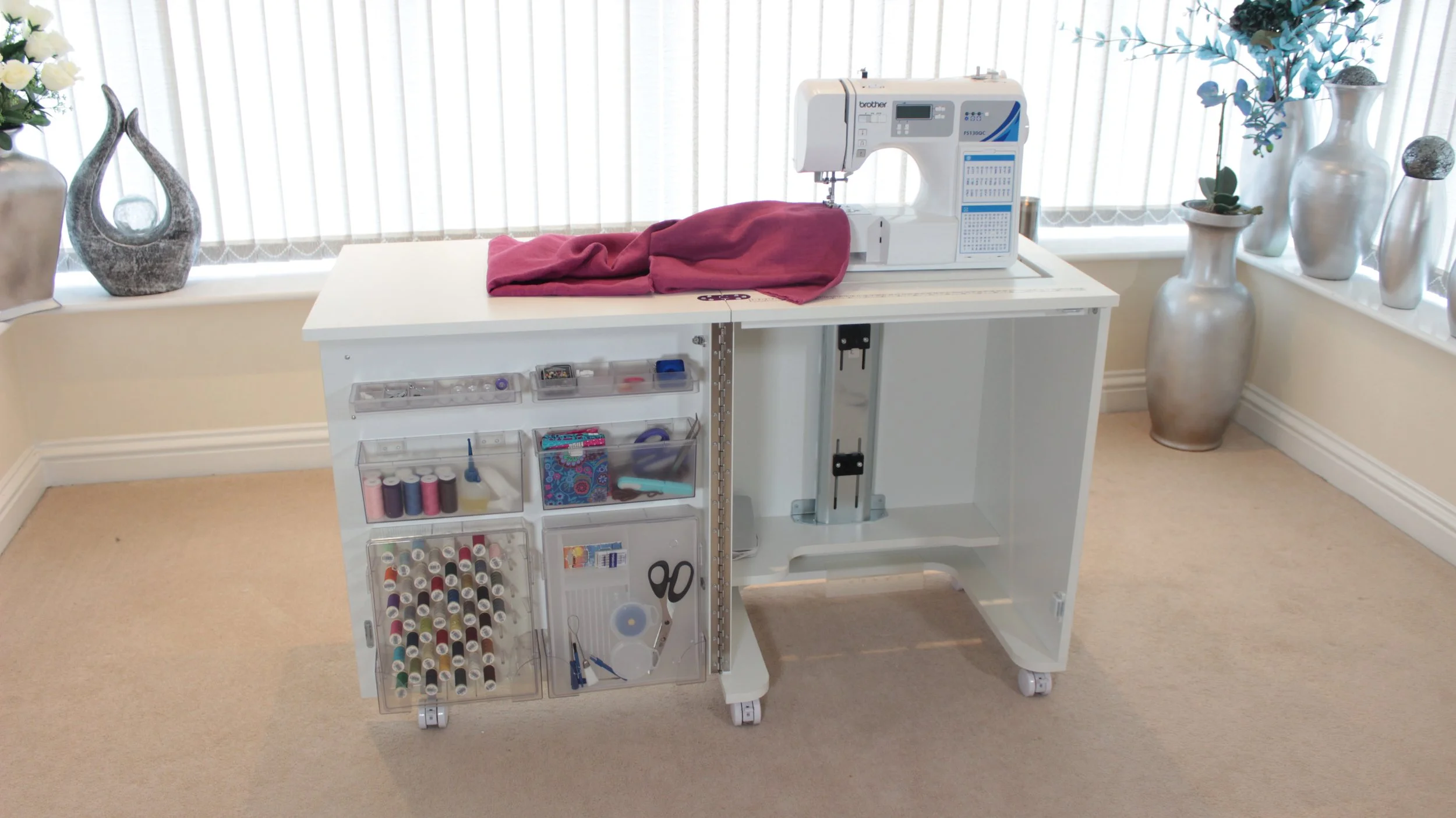 The Cub Plus, a sewing cabinet with a classic design, is perfect for smaller sewing areas. It includes a 3-step Air-Lifter, removable transparent door storage for accessories, and a designated space for your sewing machine. Experience the benefits of a full-size sewing cabinet in an elegant and space-saving design.