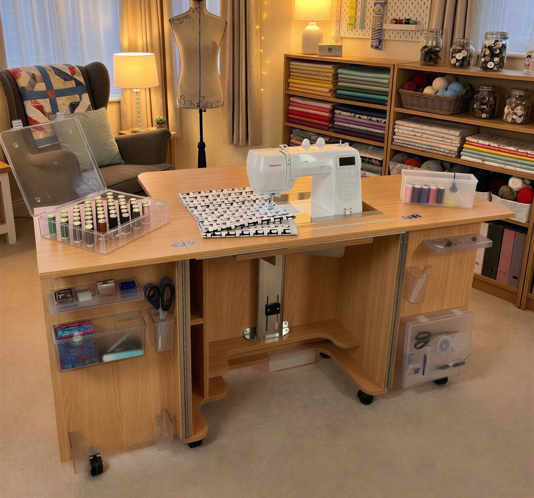 Surprisingly compact, this cabinet measures only 2.5ft x 1.5ft when closed, yet still accommodates many of the domestic sewing machines in today's market.
